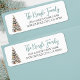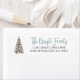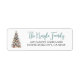 This festive return address label features a charming Christmas tree made of stacked seashells in soft hues of blue, white, and pink, topped with a small starfish for a whimsical coastal touch. The seashell tree rests on a sandy base, capturing the relaxed beauty of the beach at Christmastime. On the right, your name and address appear in a mix of blue and dark gray fonts for a clean, modern look.