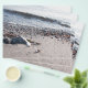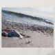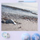 Close up photo of a little wave hitting the beach over seaweed and sand. Out of focus stones in the forground.
