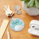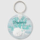 This ocean themed personalised keychain features a white sand dollar and 2 starfish with aqua glitter coral branch, on a rustic beach wood background.