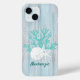 Personalise this coastal beach driftwood phone case, with a white sand dollar and 2 starfish and aqua glitter coral branch, for yourself or a gift.