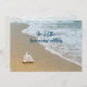 Beach themed new address announcement cards. Customise text over beach scenes on both sides. A single big seashell sits in the sand at the edge of the ocean. Text is dark blue.