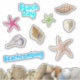 A collection of shaped stickers with a beach theme. Seashells and starfish, or sea star, images make individual shaped stickers for scrapbook pages, journals, packages, books, envelopes or whatever you like. Two places have template text and the sample wording is, “Beach day” and “Beachcombing”. One border of seashells is printed along the bottom. Shells include a spotted junonia, heart cockle, lightning whelk, and starfish in brown, pink and green. The sticker sheets come in a variety of sizes with transparent outline option.