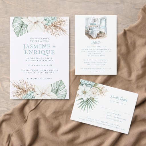 This beautiful beach themed Details enclosure card features watercolor design perfect for your holiday beach wedding. The graphic of a beach hotel room with a bed and the ocean in the background. Colours used include, slate blue, forest green, ivory and tan.