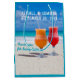 Wedding welcome, or favour, paper bags with customisation. Frosty drinks on beach sand design with two places for your text. Names of the bride and groom, with wedding date, at the top. Add a little “thank you” to guests also, if you wish. Bag colour is sea blue-green with modern white printed font and script in blue-green. You may change the bag size, but text will not fit on all options.
