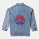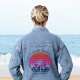 Cool matching family vacation denim jackets for women to wear on an island cruise. Features beautiful palm trees in front of a pretty pink beach sunset. Perfect custom jean jacket for your summer trip to the sea.