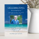 Funeral remembrance invitation featuring a beach ocean backdrop, a photo of the person, and a blue celebration of life template that is easy to personalize.