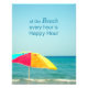 A photograph of a colourful beach umbrella with the saying "at the Beach every Hour is Happy hour".