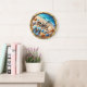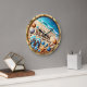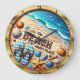 This circular wall clock features a serene beach scene with rolling ocean waves crashing onto sandy shores, adorned with various seashells and a starfish. A pair of blue and white striped flip-flops rests on the sand. The heartfelt message "The BEACH IS MY HAPPY PLACE." is prominently displayed. The entire design is encased in a golden, ribbed frame.