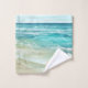 Create a seaside spa and vacation vibe with this cool coastal bath towel set featuring watercolor tropical turquoise and seafoam ocean waves, coral starfish and "the beach is my happy place" caption in a nautical navy blue handwriting font. Art by KL Stock