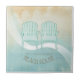 This ceramic tile design in the soft colours of sea and sand allows you to easily add your own name and text using the provided template. The simple Adirondack chairs image on a distressed, watercolor background is highlighted by a wave accent in aqua and white. Search ID623 to see coordinating seaside elements and additional products with this design.