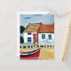 Just a postcard to keep in touch with someone. An illustration of a beach house and red boat sitting on the shore.