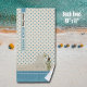Personalised Beach House Beach Towel | A pretty beach scene on a polka dot beach towel is personalised with your family name. All text is editable so even "beach house" can be changed to something else if it better suits your needs. Pretty blue polka-dots on a creamy background. An Adirondack chair sits on a sandy beach by the water. A butterfly and a cluster of pussy willows add the finishing touch.