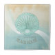This ceramic tile design in the soft colours of sea and sand allows you to easily add your own name and text using the provided template. The simple clam shell image on a distressed, watercolor background is highlighted by a wave accent in aqua and white. Search ID623 to see coordinating seaside elements and additional products with this design.