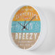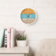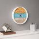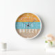 This cute, personalised wall clock is inspired by the beach and relaxing summer days. The all-white typography says, "Summertime and the Livin' is Breezy." The background is colour-blocked with the top a sunny orange, the middle a wavy blue to look like ocean water and the bottom a sandy beige. The design has cute flourishes and white markings along the edge to tell the time.