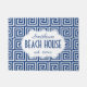 This upscale nautical doormat has a vintage Art Deco vibe in navy blue and white. The pattern is a geometric Greek key - with a white curvy banner in the centre for you to add your personalised text.