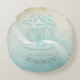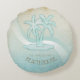 This round throw pillow in the soft colours of sea and sand allows you to easily add your own name and text using the provided template. The simple palm trees image on a distressed, watercolor background is highlighted by a wave accent in aqua and white. Search ID623 to see coordinating seaside elements and additional products with this design.