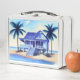 Lunch box in an illustration of a charming beach house with a veranda stands nestled between two tall palm trees, facing a serene ocean under a bright, clear sky.