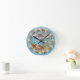 GONE TO THE BEACH, reads the driftwood notice on this seaside themed wall clock. 12 scallop shells fixed to a circle of rope are used in place of numerals. Beach hut effect background with shells, starfish, seahorse and fishing net decoration.