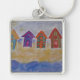 The sun is shining from a clear blue sky, blue waves lap against the shore and a row of brightly painted beach huts sits on the golden sand. if you love a hot afternoon at the beach, you will adore this colorful beach huts original watercolor painted in vibrant pastel shades of pink, blue, orange, green, red, yellow and turquoise.