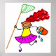 Whimsical cute cartoon drawing of a little girl at the beach with her fishing net and bucket of water ready to put her sea creatures in.