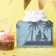 Modern beach theme geometric design with palm tree silhouettes, surfboard and scooter on distressed blue background