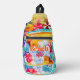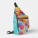 Your first name on the side of this custom sling bag along with a fun pattern of colourful beach umbrellas, waves on a sandy beach, sunbathers, and