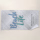 Beach Life with name and location beach towel. Faux whitewash wood background. Add your name and location/established date.