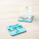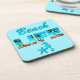 Coasters with the caption "Beach Life" embellished with an image of a sandy beach and palm trees, and a seahorse and starfish