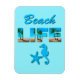 Magnet with the caption "Beach Life" embellished with an image of a sandy beach and palm trees, and a seahorse and starfish