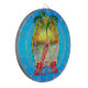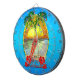 Mele Kalikimaka, Hawaiian for Merry Christmas. Beach art with a palm tree decorated with Christmas lights and ornaments and a tropical ocean blue background.