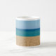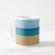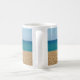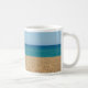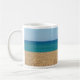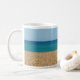 Photograph of a beach, ocean and sky in three horizontal strips of different colour.