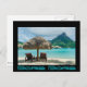 Postcard with a thatched parasol and two sunlounger chairs on a white sand beach in a luxury overwater bungalow resort in the clear blue lagoon of the pacific island of Bora Bora, near Tahiti in French Polynesia with a black border and the text: 'Bora Bora'.