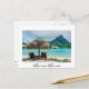 Postcard with a thatched parasol and two sunlounger chairs on a white sand beach in a luxury overwater bungalow resort in the clear blue lagoon of the pacific island of Bora Bora, near Tahiti in French Polynesia with a white border and the text: 'Bora Bora'.