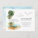 Modern watercolor beach scene with two beach chairs, white umbrella, palm trees & seagulls coastal moving announcement.
