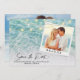 This stylish beach palm string lights tree destination wedding Save the Date features your own photo features your wedding date on a instant photo frame, and elegant hand lettered calligraphy script on a tropical beach background with tropical palm trees and string lights. A wonderful way to invite your guests to your tropical seaside or ocean front location wedding in Hawaii, Florida, California, Mexico, or other destination wedding location.
