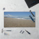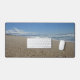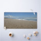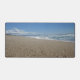 The photo featured on this desk mat captures the brown sand leading to the rolling surf. The blue ocean appears under the brighter blue sky with a few puffy clouds.