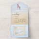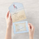 Beautiful watercolor illustrated all-in-1 beach coastal nautical themed wedding invitation with wedding details, tear off rsvp with menu options, self addressed. Engagement photo with overlay text on the inside. Repeated on the outside, slightly opaque so you can see text above it.