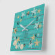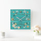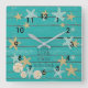 Personalise your coastal decor house or vacation cottage with this rustic beach themed wall clock. Your choice of round or square. Printed with a rustic wood plank pattern background in turquoise blue and starfish accents. Edit the text if desired. See many other coordinating items in this "Beach Stripes and Starfish" collection at Camp_and_Cottage on Zazzle.