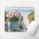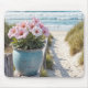 A blue pot filled with pink petunia flowers sits on a wooden railing, overlooking a sandy path leading to the ocean