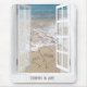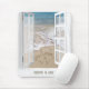 Open window with sheer curtains overlooking beach sand hearts with couple's names.