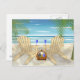 Postcard with beach scene. two chairs, basket with wine and glasses, and a book.