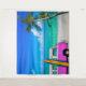 This tropical beach scene design features a bright fuchsia pink van and colourful surfboard near palm trees and on a white sand beach with turquoise sea blue water. This is the perfect design for a party photo booth backdrop, or for the surfer, for the college student's dorm room, for a bedroom, office, or any space where you want to bring in the tropics. Design and photographs of the beach and palm trees by T.K. Goforth and signed by the artist, all rights reserved.