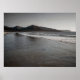 A stunning photograph that captures the rugged beauty of the coast. The foreground is dominated by intricate, exposed driftwood or roots resting on the smooth sand, leading the eye toward the dynamic waves and expansive ocean horizon. This dramatic yet serene design showcases the raw textures of nature, providing a timeless and sophisticated view of a wild shoreline environment.
