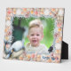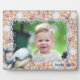 Seashells standing photo frame for a child's picture and custom text. Horizontal, 8x10 inch frame with easel with under the sea design. Photo plaque for commemorating a special birthday or new baby. Peach and pink seashells, with white starfish surround the child's photo. A happy blue whale decorates the lower lefthand corner. This makes a lovely gift for the grandparents and / or new parents.
