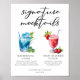 This chic beach signature mocktails menu poster features simple black typography above 2 seaside drinks and their ingredients for your coastal party. A cute Blue Hawaiian sunrise drink and non-alcoholic Strawberry Daiquiri drawing add a cool flair to your bar menu. Complete with the couple's names and date for their reception.