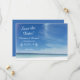 Flat save-the-date card for the Beach Sky Cloud & Seashells Suite. A photo of a white sand beach beneath a brilliant blue sky is the focal point of the design. The wispy cloud blows towards the words, drawing the eye to the text. Seashell graphics emphasize important words and white dotted lines act as separators. A white glow emanates from the photo. Allow the day to whisk you away like the cloud.