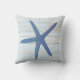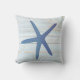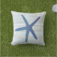 Beach outdoor decorative throw pillow for your patio, porch or pool area in a rustic wood background with a watercolor blue starfish design.