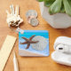 Wedding favour key ring with beach scene, starfish and sand dollar. Customise with names of couple, "thank you" text, or leave blank. For personal use, or for bridal party gifts, include a name in blue script.