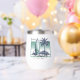 Beach Summer 2024. Summer Party. Blue Green Beach Scene with Surf Board & Palm Tree.