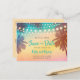 This colourful Save the Date Postcard features a beach scene at sunset with palm trees, a warm sky and hanging lights. The design is perfect for a Summer Wedding, Beach Wedding or Destination Wedding. The illustration and colour palette have a vintage retro feel, while the string lights add a modern and chic touch.